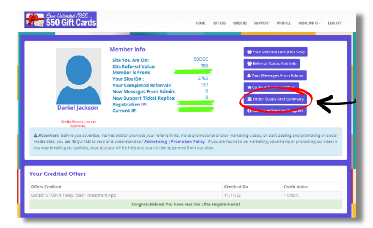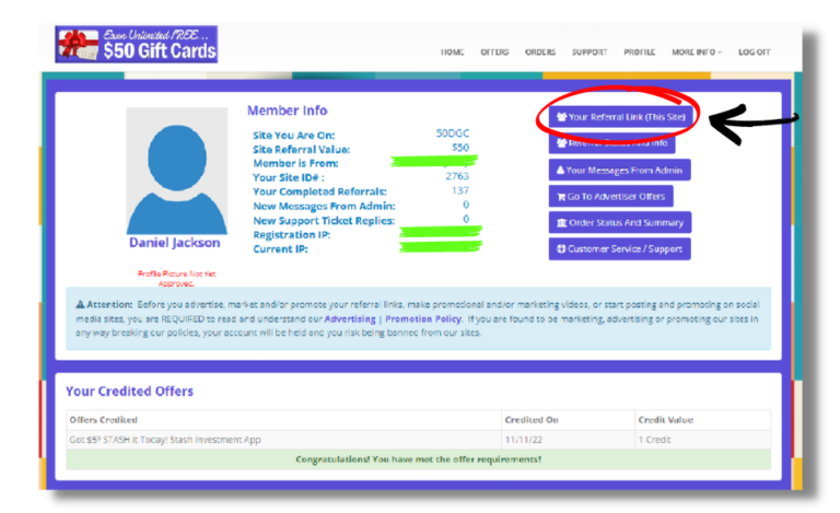 Completing the offer requirements for the site allows you to refer others and receive a “free incentive” gift when they complete them as well. In this case, it’s $50/gift cards.